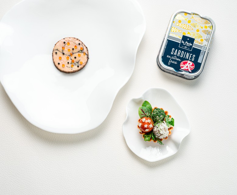 Terrine de Foie Gras marbrée, rillettes de sardines à la criste marine et blinis aux herbes fraîches par le chef Benjamin Patissier